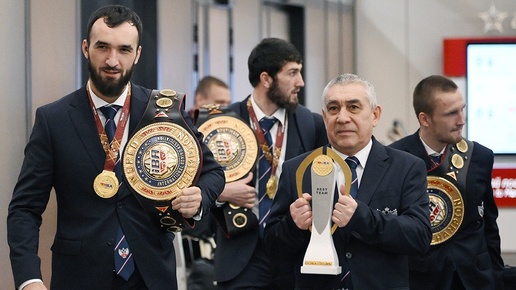 Сборная России по боксу прилетела в Москву из Дубая, где стала победителем общекомандного зачета чемпионата мира. Триумфаторов в аэропорту Шереметьево встречали хлебом-солью. Также членов сборной страны ожидали представители СМИ. Российские боксеры показали лучший результат в истории чемпионатов мира, завоевав семь золотых медалей. Обладателями золота стали: в весовой категории до 60 кг - Всеволод Шумков, в категории до 63,5 кг - Илья Попов, до 75 кг - Исмаил Муцольгов, до 80 кг - Джамбулат Бижамов, до 86 кг - Шарабутдин Атаев, до 92 кг - Муслим Гаджимагомедов, свыше 92 кг - Давид Суров...