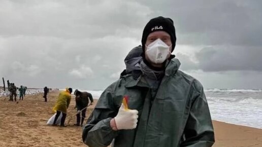 Красноярский футболист Сорокин помогает очищать пляж Кубани от мазута
