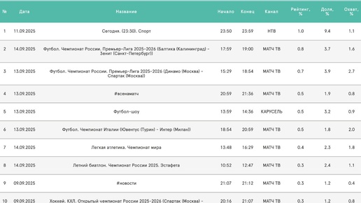ФК и ХК "Спартак" в топ-10 недели «ЧТО ПО ТЕЛИКУ»? Итоги спортивного смотрения 08.09-14.09, Россия, 4+ (137,4 млн чел.) 🗣 Матч "Балтики" с "Зенитом" обходит московское дерби, а во второй половине топа недели - разнообразие спорта. Хоккейный "Спартак" тоже отметился, замкнув лучшую десятку. 🗣 Неделя Кубка и РПЛ. "Матч ТВ" покажет "Спартак" лишь в четверг (кубковый "Ростов", 20:45). В воскресенье игра чемпионата с "Крыльями" будет на платнике (14:30). Топ 25/26: 1.1🥇- 🔴:🔵| ⚽️ 1.1🥇- 🇶🇦:🇷🇺 | ТМ 1...