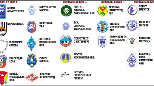 Мы сформировали список всех футбольных клубов России, которые были созданы или восстановлены за последние 20 лет. В 2000 году основано 10 клубов. 5 команд возникло в следующем году, но все уже закрылись. В 2008 году появляется гордость всего Краснодарского края и, может быть, всей России ФК "Краснодар". За свою не долгую историю клуб заимел современнейший стадион, завоевал медали чемпионата России, побывал в еврокубках. С 2009 году родился клуб, который выступает в высшей лиге российской футбольной системы...