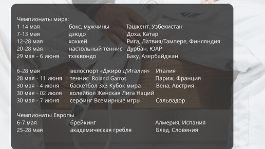 Для поклонников олимпийских видов спорта в мае будет что посмотреть. Зимний сезон завершится чемпионатом мира по хоккею, который пройдет в Латвии и Финляндии (а мог бы в России). В летних видах болельщиков ждут чемпионаты мира по боксу, дзюдо, настольному теннису и тхэквондо. В боксе российские спортсмены выступят под флагом страны. Из еще заметных стартов можно отметить Кубок мира по баскетболу 3*3. Это аналог чемпионата мира. В волейболе у женщин стартует Лига Наций. В серфинге главные соревнования года - Всемирные игры...
