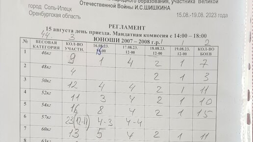 с 16 по 19 августа 2023 года в Соль-Илецке Оренбургская область прошел Межрегиональный турнир по боксу среди юношей 2007–2008 г. р., посвященный памяти И. С. Шишкина В начале августа нам предложили поучаствовать в нем, прислали положение где было красиво написано, что турнир класса «Б» и за победу положено спортивное звание кандидата в мастера спорта по боксу. Путь не близкий, но решили поехать не смотря на уговоры знакомых тренеров, что места там «заряжены» под своих. Мы слишком хорошо были подготовлены и не сомневались в победах своих воспитанников...