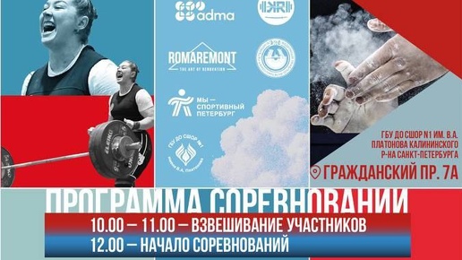 С 23 по 25 апреля в спортивной школе олимпийского резерва №1 Калининского района Санкт-Петербурга им. В.А. Платонова пройдёт чемпионат Санкт-Петербурга по тяжёлой атлетике среди мужчин и женщин. Приходите...