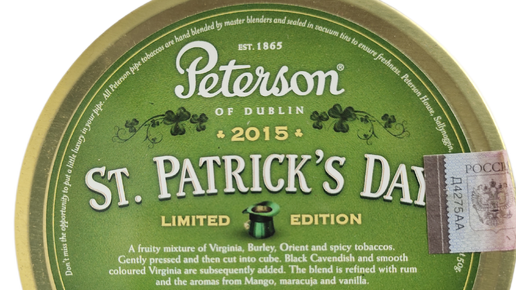Крепость /4 из 10/ ниже средней Производитель: Kohlhase, Kopp and Co. DE Состав: Black Cavendish, Burley, Oriental, Virginia Ароматизация: Алкоголь, фрукты, ваниль Нарезка: Coarse Cut "Табак для трубки Peterson of Dublin 2015 Limited Edition 2015 St. Patrick`s Day – это великолепная смесь нескольких сортов Вирджинии, Берли и пряных, пикантных Ориенталов. После смешивания в табак добавляется выдержанный под прессом и нарезанный кубиками Темный Кавендиш, наполняющий вкус смеси ароматами рома, ванили и экзотических фруктов...