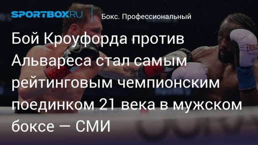 Advertisements Advertisements В ночь на воскресенье в Лас-Вегасе (США) состоялся исторический бой за титул абсолютного чемпиона мира во втором среднем весе между американцем Теренсом Кроуфордом и мексиканцем Саулем Альваресом. По данным пресс-службы стримингового сервиса Netflix, этот поединок собрал рекордную телеаудиторию — более 41 миллиона зрителей по всему миру. Это сделало его самым просматриваемым мужским боксерским поединком за звание чемпиона в XXI веке. Кроуфорд — первый в истории абсолютный чемпион мира в трех весовых категориях...