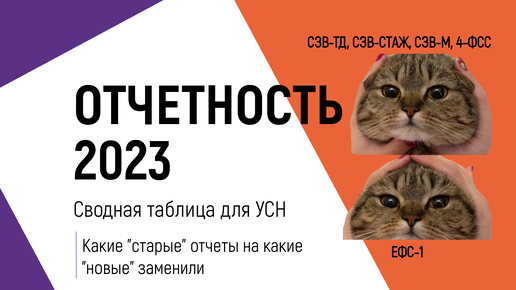 В 2023 году бухгалтеру предстоит привыкнуть не только к новой объединённой форме ЕФС-1, но и к новым срокам сдачи. Для вас мы объединили в одну таблицу, какие "старые" отчеты на какие "новые" отчеты заменены, а также обновленные сроки их сдачи для компаний или ИП на УСН. Сводная таблица по отчетности на 2023 год для компаний или ИП на УСН: КАК БЫЛО? ФНС ПФР ФСС Статистика КАК СТАЛО? ФНС Примечание по поводу НДФЛ - поменяли все, что можно: СФР Статистика Проверить, что вы должны статистике за 2022 можно тут...