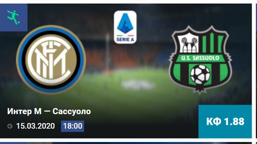 В воскресенье, 15 марта, на стадионе Джузеппе Меацца Интер примет Сассуоло в 27 туре чемпионата Италии по футболу. Хозяева — одни из фаворитов Серии А, которые продолжают борьбу за золотые медали, а гости крепкие середняки национального первенства. Если хотите сделать ставку на Интер — Сассуоло в БК Winline, советуем изучить прогноз на матч на сайте Спорт Ставки. Читайте также: ПСЖ — Боруссия Дортмунд: прогноз и ставка на матч Интер У черно-синих были отменены уже два матча в национальном первенстве из-за эпидемии коронавируса в Италии...