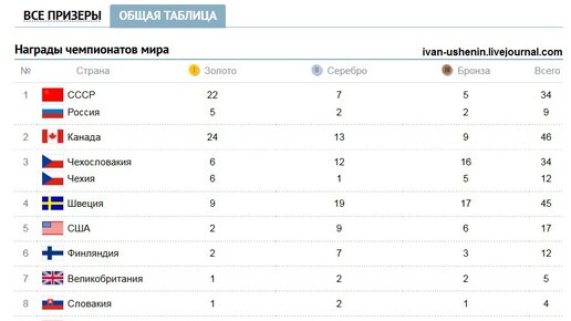 Статистика по победам в ЧМ по хоккею СССР, России и Канады