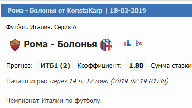 Чемпионат Италии Seria A. Прогноз на матч Рома - Болонья 18 февраля 2019 г. независимая ставка от сайта прогнозы на футбол сегодня на встречу римлян с болонцами. Статистика перед игрой Рома - Болонья 18 февраля Римляне выиграли два матча подряд у Кьево на выезде 3:0 и главное у Порто 2:1 на своём поле в лиге чемпионов. Победа над португальцами наверное сбросило груз ответственности первого раунда плей-офф главного еврокубка. По статистике ФК Рома редко проигрывает, а зачастую их виктории уверенные больше, чем в один гол...