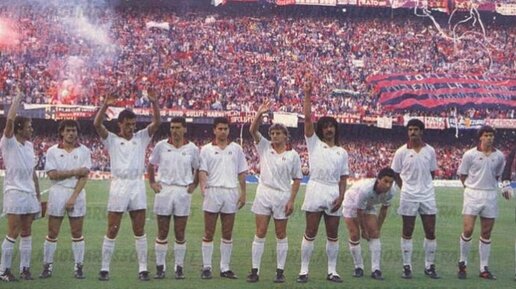 24 мая 1989. Финал. Милан (Италия) - Стяуа (Румыния) 4:0. За четыре дня до финала в Барселону толпами прибывали итальянские тиффози: по земле, по морю и по воздуху. В надежде лично увидеть третью победу «Милана»в Кубке Чемпионов.«Милану» была гарантирована почти абсолютная поддержка трибун,на стадионе Камп Ноу в Барселоне.Поклонников «Милана» было около восьмидесяти тысяч,на стотысячной арене.Румын поддерживало лишь горстка болельщиков,прибывших из социалистической Румынии.Форвард «Стяуа» Мариус Лэкэтуш заявил что симпатии трибун не особо волнуют его команду...