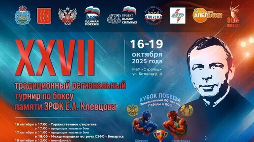 С 16 по 19 октября 2025 года в МБУ «Стрелец» по адресу ул. Ботвина, д. 4, состоится значимое спортивное событие – XXVII традиционный региональный турнир по боксу, посвященный памяти Заслуженного работника физической культуры Евгения Афанасьевича Клевцова, сообщили "МК в Пскове" в пресс-службе администрации Великих Лук. Турнир обещает быть насыщенным и зрелищным. Программа соревнований стартует 16 октября в 17:00 торжественным открытием и первыми предварительными боями...
