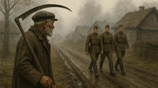 Осень 1943 года. Только что освобождённая прифронтовая деревня. По утрам — туман, по вечерам — гул дальней артиллерии. Люди возвращались в полуразрушенные дома, а по просёлкам снова шли солдаты — пыльные, уставшие, с котелками на боку. Но среди них оказались и те, кто был одет слишком аккуратно, говорил слишком ровно, пах не потом, а чужим табаком. Их заметил старик. Он косил траву у оврага, когда мимо прошла группа из трёх человек. Форма на них — будто только что из вещевого склада: выглаженная, сапоги блестят, лица чистые...