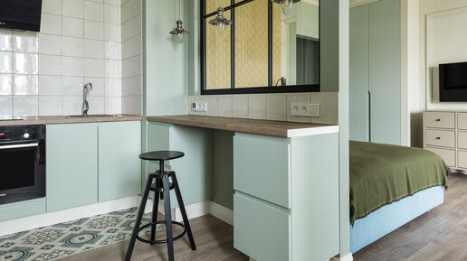 Дизайнер Ксения Замалиева оформила студию 36 м² для молодой девушки. Практически сразу после завершения ремонта заказчица переехала к молодому человеку, поэтому сейчас квартира сдаётся в аренду. Планировка Кухня Плиткой в кухне выделили только зону готовки — на пол положили керамику с орнаментом, а для фартука выбрали квадратную глянцевую плитку. Поскольку заказчица готовит нечасто, кухонный гарнитур укомплектовали только самым необходимым. Отдельно стоящий холодильник упаковали в короб, чтобы он не рушил геометрию кухни...