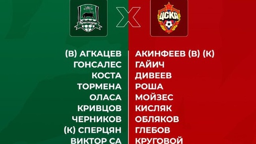 Суперкубок России по футболу 2023: старт через час. Команды-участницы представлены следующим составом:. Вратари: Агкацев («Краснодар»), Акинин («ЦСКА»). Защитники и полузащитники: «Краснодар» — Олса, Коста, Тормена, Гонсалвес, Черниковы, Кривцов, Сперцян, Са...