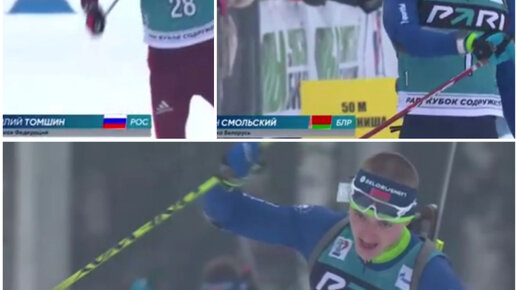 После квалификации, результаты которой я привёл в публикации, мужчины завершили суперспринт гонкой с масс-старта на 7,5 км. Стреляли уже 4 раза: подряд 2 "лёжки" и затем 2 "стойки". Штрафные круги по 75 м, короткие, как и сама гогка. После 1 рубежа в лидерах белорус Антон Смольский, и ещё трое его товарищей по команде в десятке: Наши парни тоже рядом и вся борьба только начинается. Вторая стрельба: Итак, Пащенко, Латыпов, Томшин - они не ошиблись и продолжают находиться в группе лидеров. Смольский и Тулатин - в тройке...