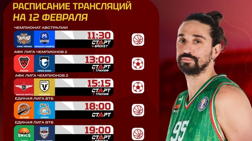 ! В программе австралийский баскетбол, Единая Лига ВТБ, а также заключительные матчи первого раунда 1/8 финала АФК Лига Чемпмонов 2 и группового этапа мужской волейбольной Лиги Чемпионов. Проведите этот день на платформе TVSTART...