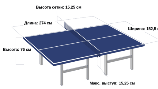 Всё о теннисе Настольный теннис: инвентарь и оборудование, возраст участников, виды соревнований. Стол размеры. Стол имеет форму прямоугольника, длина которого — 2740 мм, ширина — 1525 мм. Высота от поверхности стола до пола площадки — 760 мм. Поверхность стола должна быть в строго горизонтальном положении, гладкой, ровной, изготовленной из крепких, сухих и твёрдых досок и создавать равномерный отскок мяча, выпущенного с высоты 300 мм, на высоту 230 мм. Поверхность стола должна быть матовой с белыми...