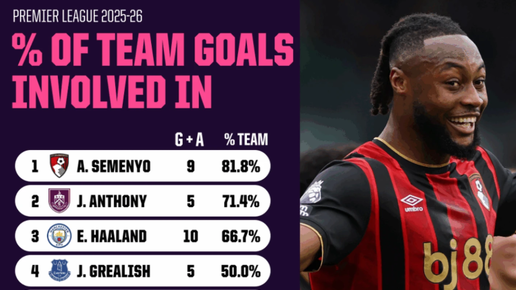 В мире футбола всегда есть место для неожиданных героев, и в этом сезоне таким стал вингер «Борнмута» Антонио Семеньо. Статистика говорит сама за себя: 6 голов и 3 голевые передачи в 11 матчах — почти 82% всех голов команды! Это абсолютный рекорд в английской Премьер-лиге на данный момент сезона 2025/26. Но что стоит за этим феноменом? Как Семеньо, игрок, которого многие считали «средним» по меркам топ-лиги, смог подняться до уровня суперзвезды? В отличие от привычных лидеров, Семеньо не был звездой мирового масштаба до начала сезона...