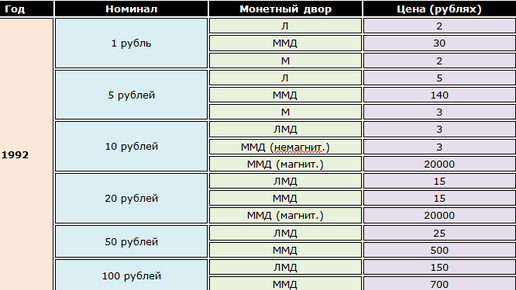 Цены на монеты России 1992-1993 годов - таблица с ценами
