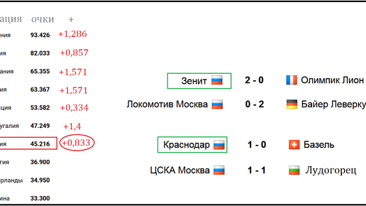 Завершился групповой этап еврокубков, и настало время подсчитать количество баллов, которые наши команды принесли России в таблице коэффициентов УЕФА с начала нынешнего сезона. Всего от России в еврокубках стартовали 5 команд: "Зенит", "Спартак", "Локомотив", "Сочи" и "Рубин". Для начала нужно напомнить, как начисляются баллы в еврокубках: Для расчета рейтинга ассоциации общее количество баллов, набранное всеми ее командами, суммируется и потом делится на количество команд, изначально участвовавших от данной ассоциации в еврокубках (в нашем случае число команд будет равно 5)...