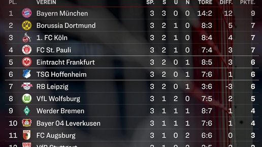 #Бундеслига 🇩🇪 Итоговая таблица Чемпионата Германии - 2025/2026 по футболу после 3-х туров 📝 Что отметим: 🥇 «Бавария» - безоговорочный лидер по всем показателям. 🆕 «Санкт-Паули» и «Кёльн» – открытия сезона! ⁉ Две «Боруссии» - две полярности...