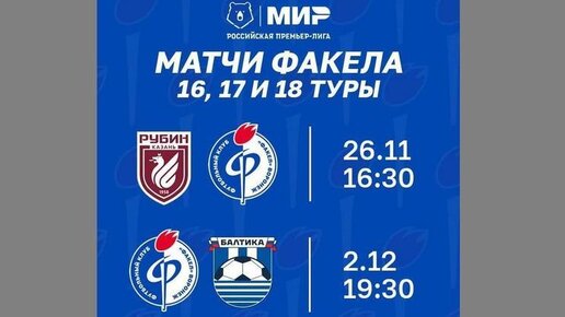 Российская Премьер-Лига опубликовала детальный календарь оставшихся трёх туров национального чемпионата. Воронежский «Факел» 26 ноября сыграет в Казани против местного «Рубина», а затем подопечных Сергея Ташуева ожидает два домашних поединка. В субботу, 2 декабря «огнеопасные» встретятся с «Балтикой», а 10 декабря примут столичное «Динамо» на Центральном стадионе профсоюзов...