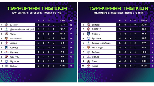 «Бурятия» U15 осталась на прежнем месте Юношеская команда улан-удэнской спортивной школы №6 (U16, 2009 г.р.), одержав 16 июня волевую победы над омским «Иртышом» со счётом 3:2, поднялась на четвёртую строчку в турнирной таблице Юношеской футбольной лиги (ЮФЛ Сибирь-2). У юношей 9 очков после четырёх игр. Команда СШ№6 (U15, 2010 г.р.), уступившая «Иртышу» в ЮФЛ Сибирь-3 0:2, осталась на девятом месте. У подростков по-прежнему всего одно очко после четырёх игр – одна ничья, три поражения. «Старшие львы («Енисей» - ред...
