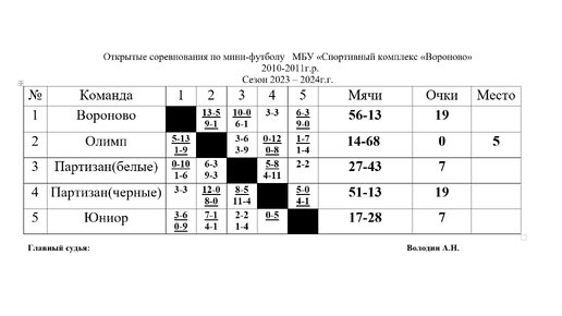 Таблица соревнований по мини-футболу МБУ "СК "Вороново" 2010-2011, после 9 туров. #мбусквороново #сквороново #вороново #минифутбол