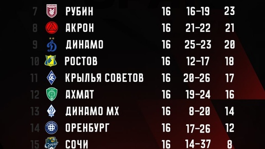 Таблица РПЛ по итогам 16-го тура. Сократили отставание от первого места до 6 очков. В следующем туре сыграем с «Балтикой» в Калининграде (29 ноября, суббота). Начало матча в 19:30 по мск. В среду нас ждет ответная игра четвертьфинала Кубка России против Локомотива (начало в 20:30)...