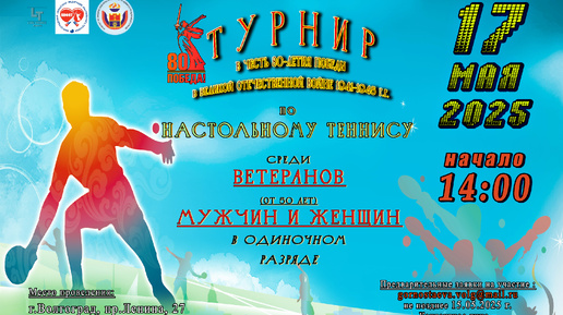 Доброго времени суток, уважаемые любители настольного тенниса!☀️ В субботу, 17 мая 2025 года, Волгоградская областная Федерация настольного тенниса (ВОФНТ) приглашает спортсменов Волгограда принять участие в Турнире по настольному теннису, посвященному 80-летию Победы в Великой Отечественной войне 1941-1945 г.г., среди ветеранов (от 50 лет)! Место проведения: г.Волгоград, пр. им. В.И. Ленина, 27, ФБОУ ВО "ВГСПУ" (большой зал, 3 этаж). Турнир среди ветеранов проводится по следующим категориям: 13:00 – Разминка, прием заявок...