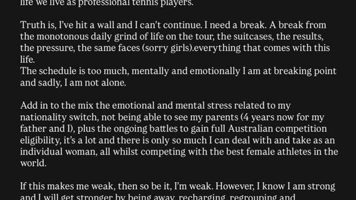 Теннисистка Дарья Касаткина рассказала подписчикам, что не справляется с высокой интенсивностью теннисного сезона, да еще адаптацией в