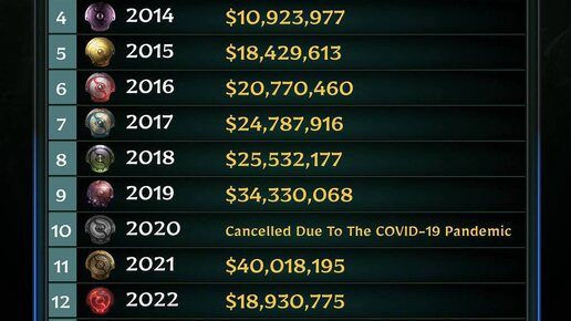 Статистика призовых фондов Ti за все года — максимальный сбор был $40 млн в 2021 году, его забрали Спириты
