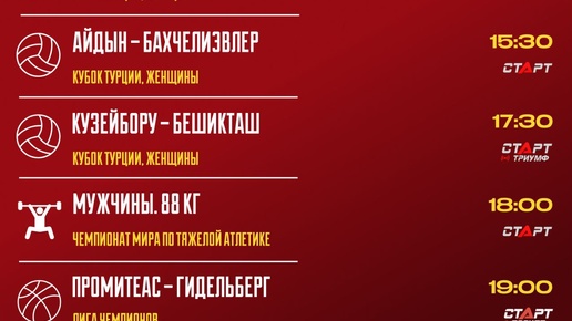 📺🍿 Спортивный вторник на TVSTART.RU! Праздник для любителей волейбола. Он возвращается в наш эфир тремя матчами женского Кубка Турции. Вечером смотрим очередные весовые категории на чемпионате мира по тяжелой атлетике и первый тур баскетбольной Лиги Чемпионов...