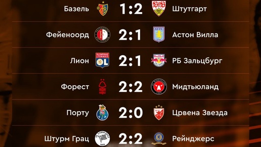 1. Антверпен - Олимпиакос 1 - 1/1 - 2. 2. Легия - Спартак 1 - 2/1 - 1. 3. Лион - Рейнджерс 2 - 0/2 - 1. 4. Наполи -Лестер 2 - 1./1 - 1. 5. Реал Сосьедал - ПСВ Эйндховен 1 - 1/1 - 2. 6. Фенербахче - Айнтрахт 2 - 0/2 - 1. 7. Штурм - Монако 1 - 2/0 - 2. 8. Селтик - Бетис 0 - 0/1 - 1...