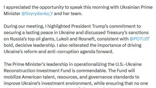 Bessent talked sanctions and reconstruction money with Ukraine’s PM today