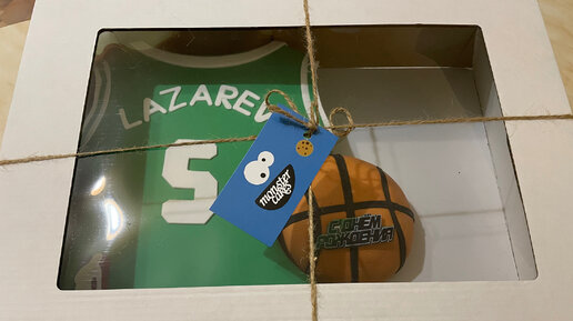 Так как день рождения был у юного любителя баскетбола, то и сладкий подарок решили выбрать именно этой тематики. Хотелось чего-то простого, но в то же время оригинального. И вот просмотрев множество образцов всевозможных тортов, решили остановиться на одном, где была изображена майка баскетболиста и мяч рядом с ней. Конечно выбрали свой нужный цвет формы и надпись. Все это отправили кондитеру, у которого уже заказывали разные торты. Он предложил выбрать начинку. Посоветовал майку сделать в виде медовика, а мяч как пирожное картошка...