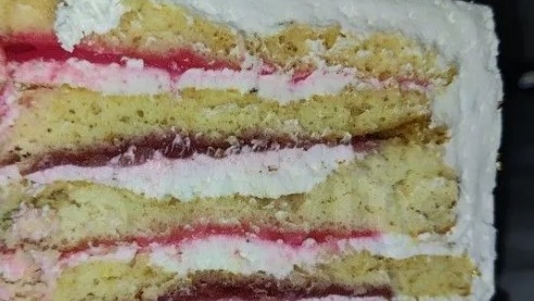"Здравствуйте! Увидела публикацию про толстую "Молочную девочку", решила поделиться и нашим разрезом. Заказывали торт на День рождения, указали крем чиз с малиной и коржи "Молочная девочка". В итоге получили самый обыкновенный белковый крем, желе из малины и простой бисквит, шоколадные шары дети даже есть не стали (сказали, что совсем не вкусно). И да, бисквиты тоже были очень толстыми, совсем не похожими на "Молочную девочку". Этому кондитеру нужно прям очень четко расписывать рецепт торта, который вы хотите...