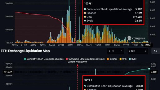 ) ➤ При резком росте #BTC до ~$101,000 объем ликвидаций SHORT-позиций превысит $5,920,000,000. ➤ При резком росте #ETH до ~$3470 объем ликвидаций SHORT-позиций превысит $3,830,000,000. Cryptо Headl