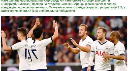 Источник: Новостной Терминал «Тоттенхэм» одержал победу в предсезонном состязании Audi Cup в матче против «Баварии». Основное время команды отыграли с результатом 2:2, и победителя выявили по серии пенальти, где «Тоттенхэм» оказался точнее (6:5)...