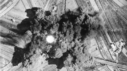 Powerful explosions of bombs dropped by American B-26 Marauder bombers from 1st Tactical Air Force to a German supply train passing the railway bridge near Ficcule, 50 miles north of Rome, on the way to Florence...