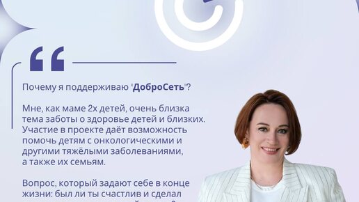 Елена Кузнецова, руководитель консалтинговой группы «PRO Смыслы», Executive-coach, бизнес-тренер и ведущий эксперт в работе с командами, приглашает вас познакомиться с двумя её онлайн-лекциями, доступными на нашем сайте. 🧬Сегодня рассказываем про одну из них — «Эволюция лидера: от управления к вдохновению». Получите доступ к записи лекции прямо сейчас, сделав пожертвование: https://clck.ru/3MKaM4 🔥 Развивайте лидерские качества и помогайте детям вместе с фондом «Нить добра»! 🔥 "ДоброСеть"...