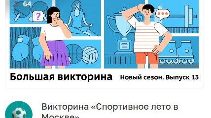 В Москве продолжается сезон летних тренировок на свежем воздухе. Бесплатные занятия с профессиональными тренерами проходят в проектах «Мой спортивный район» и «Спортивные выходные». Хотите быть в отличной форме или освоить новые виды спорта? «Большая викторина» подскажет, как это сделать. Тренировки проекта «Мой спортивный район» этим летом проходят в 10 округах столицы на 84 площадках во дворах и парках, а также на крышах районных центров «Место встречи». Хотите попробовать зумбу, йогу, растяжку...