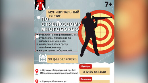 Жителей Санкт-Петербурга приглашают принять участие в муниципальном турнире по стрелковому многоборью. Соревнования пройдут: 23 февраля 2025 года с 10:30 до 14:30 (п. Шушары, Старорусский пр. д. 8, к. 1, Молодежное пространство «3 этаж»); с 17:00 до 21:00 (п. Шушары, Славянка, ул. Ростовская д. 20, стр. 1, КДЦ Green Park). Участников ждут: – стрельба на профессиональном стрелковом тренажёре по спортивным мишеням из пневматической винтовки...