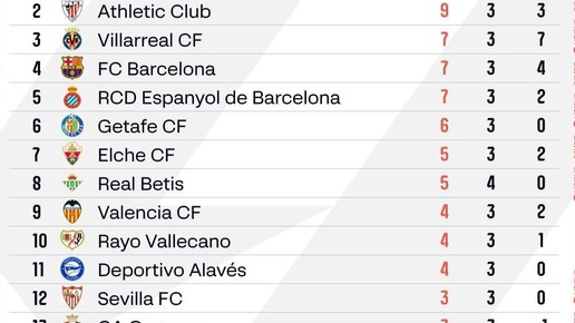 А вот турнирная таблица Испанской Ла Лиги после 3- го тура , хотя 2 команды сыграли уде 4 игры - Реал Бетси и Сельта. Ну Реал Мадрид и Атлетик Бильбао сейчас идут без потерь, у них по 9 очков. А вот Барселона уже допустила 1 осечку сыграли в ничью...