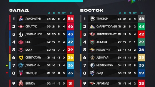Из интересного , что на второе место на Востоке переместился Салават Юлаев , сдвинув на третье место хк Автомобилист . На Западе все практически без изменений , но ЦСКА приближается к СКА , команды идут...