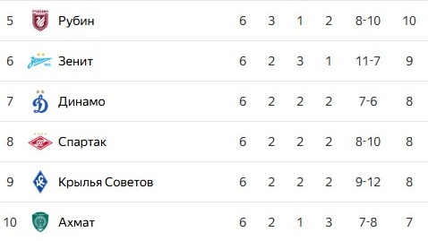 Турнирная таблица после 6-ти проведенных туров "МИР РПЛ": Сразу бросается в глаза положение команд в первой тройке - добавить сюда "Зенит" и кажется именно эта четверка способна разыграть между собой чемпионский титул текущего сезона. Вообще, концепция борьбы в чемпионате обострилась с начало сезоне актуальнее - всему виной два фактора: очевиднейшие потери очков "Зенита" и крепкий набор очков "Локо" и "ЦСКА"...