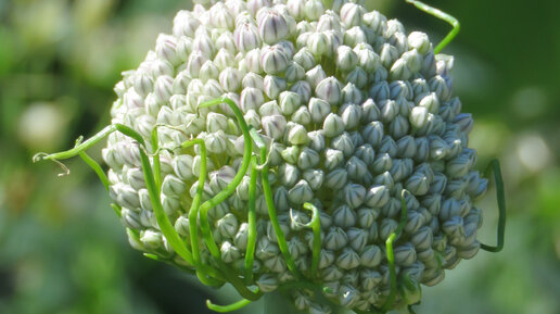 Вот этот гибридный лук по имени "Уайт Клауд" обрадовал меня не только хорошим размножением, но и фактом - он не подгнивает. Ни одной подгнившей луковицы, в момент обязательной выкопки для просушки, я не нашла. Сам по себе в цветении он, скорее, интересен, чем ярок и брутален. Да, высотой почти метр. Да, почти белого цвета. Цветение позднеиюльское. Декоративность достаточно долгая. Я прям сомневалась в начале цветения в его сортности, он по виду сильно лук-батун напоминал...