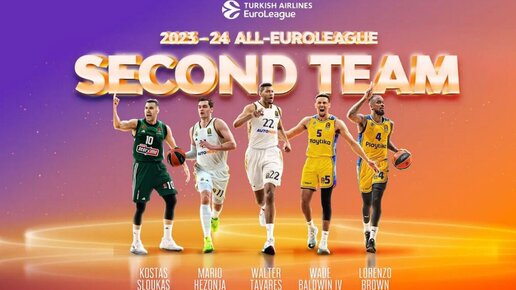 Во вторую символическую пятерку вошли: Костас Слукас («Панатинаикос»), Уэйд Болдуин («Маккаби»), Лоренцо Браун («Маккаби»), Марио Хезоня («Реал»), Уолтер Тавареш («Реал»). Трехкратный член первой сборной Евролиги (2021-23) центровой «Реала» Эди Тавареш оказался во второй пятерке после спада в регулярном чемпионате. Центровой в пятый раз попадает в сборные сезона...