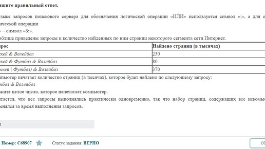«И» –– символ «&». В таблице приведены запросы и количество найденных по ним страниц некоторого сегмента сети Интернет. Компьютер печатает количество страниц (в тысячах), которое будет найдено по следующему запросу: Футбол & Волейбол Укажите целое число, которое напечатает компьютер...
