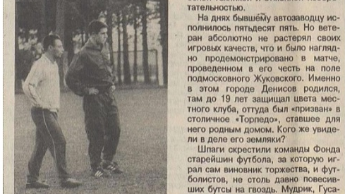 * И продолжая тему, нашёл более поздний (за тот же, 1993 год), материал о турнире ветеранов в гор. Жуковском, в честь торпедовца Валентина Денисова - А.К. * Стараюсь не обращать внимания на "сопутствующие" заметки газет тех тяжёлых для меня дней... - А.К. * По моим далеко неполным данным, до окончания 1993 года торпедовцы не играли более товарищеских матчей и не участвовали в турнирах, кроме первенства и кубка России и еврокубка. Очень рассчитываю, что товарищи читатели опровергнут это опрометчивое утверждение - А...